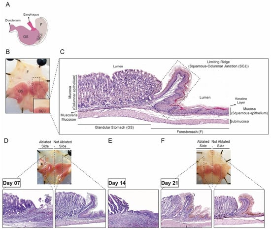 To establish the cryoablation model, the SCJ of the stomach in wild-type CB6F1 mice was ablated and histologically analyzed at day 7, 14, and 21 post-cryoablation on hematoxylin and eosin (HE) staining tissue slides. The mouse stomach consists of two main compartments, the forestomach, lined with multilayered keratinizing squamous epithelium and the glandular stomach, lined with single layered columnar epithelium. The two compartments are delineated by the SCJ as represented in Figure 3B,C. All mice received proton pump inhibition after the ablation and daily during the healing process. When compared to the not ablated side of the stomach, we observed that 7 days after the ablation the SCJ was damaged and inflamed, and both the columnar and squamous cells were absent, indicating the success of the cryoablation to eliminate both type of epithelia at the SCJ (Figure 3D). Fourteen days post-cryoablation, we found regeneration of normally appearing neo-squamous and neo-columnar proximal and distal to the SCJ in approximately 60% of the cryoablated mice. Representative HE stainings of nearly completed regenerated cryoablated mouse stomach at day 14 is demonstrated in Figure 3E. After 21 days, the ablated epithelia were completely regenerated with neo-epithelia and their histology was comparable to that of the not ablated stomach side (Figure 3F). Macroscopic analysis of surrounded tissues after culling, didn’t show any tissue injury was observed at 14 and 21 days post-cryoablation.
