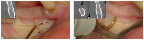 Dynamic navigated “sandwich” technique: (a) the piezo-tip was used to obtain the pre-established horizontal osteotomy, approximately 2 mm above the mandibular canal, and (b) the distal vertical one. The software, as the surgeon operates, provides an indication of where the piezosurgical insert was located relating to the bone and nerve.
