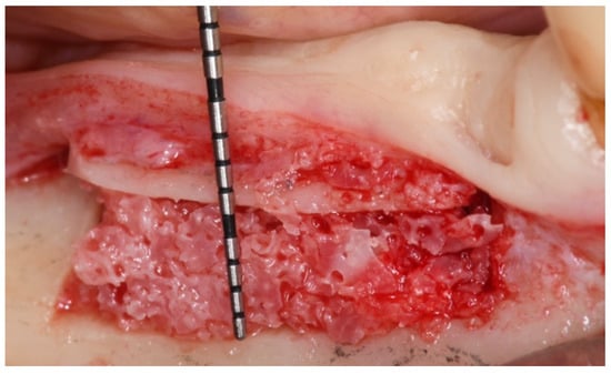 Then, the same piezo-tip was used to obtain the pre-established horizontal osteotomy, approximately 2 mm above the mandibular canal, and for the vertical ones, the first 2 mm distal to the last residual tooth and the second according to the rehabilitative plan. As the surgeon operates, the software provides an indication of where the piezosurgical insert was located relating to the bone and nerve (Figure 4). An appropriately shaped cancellous block of heterologous bone (Sp-Block, Osteobiol, Tecnoss, Giaveno, Italy) was then placed into the space obtained between the basal bone and the raised osteotomized segment (Figure 5). A resorbable collagen membrane was applied above the buccal surface to protect the surgical site. The flaps were sutured with Vicryl 5.0. The patient was then prescribed a fluoroquinolone antibiotic (moxifloxacin) twice a day for 5 days combined with azithromycin twice a day for 3 days. She was instructed to take the first tablet the night before surgery and the second one 2 h before surgery. Moreover, betamethasone was administered just after the surgery (8 mg, then tapering the daily dose) and 600 mg of ibuprofen twice a day, to be taken with meals, as long as required. Postsurgical instructions were delivered, including a soft diet for 2 weeks and appropriate oral hygiene with twice a day rinsing with 0.2% chlorhexidine gluconate mouthwash. The patient was clinically checked two weeks after surgery and at one month. No neurosensory alterations or other complications were recorded.
