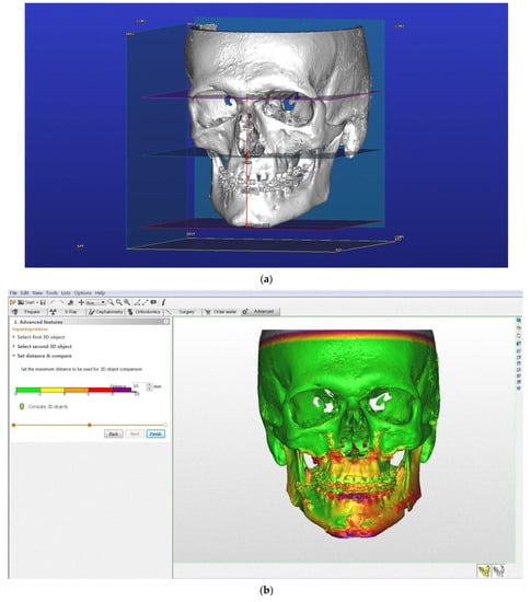 - Cevidanes, L.H.; Bailey, L.J.; Tucker, S.F.; Styner, M.A.; Mol, A.; Phillips, C.L.; Proffit, W.R.; Turvey, T. Three-dimensional cone-beam computed tomography for assessment of mandibular changes after orthognathic surgery. Am. J. Orthod. Dentofac. Orthop. 2007, 131, 44–50. [Google Scholar] [CrossRef]
