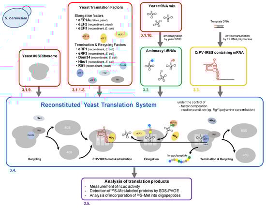 This protocol describes the reconstitution of the yeast translation system in vitro, which is capable of synthesizing long polypeptides following CrPV-IRES-mediated translation initiation, as well as recapitulating the translation elongation arrest by known downregulating sequences, such as the polyproline sequence. As illustrated in Figure 1, the procedure includes five parts: (i) preparation of yeast translation factors (elongation factors, termination factors, recycling factors, ribosomes, tRNAs); (ii) preparation of aminoacyl-tRNAs by charging yeast crude tRNA mixtures using yeast S100 extract; (iii) preparation of CrPV IRES-containing mRNA by in vitro transcription using T7 RNA polymerase; (iv) the translation reaction; and (v) analysis of the translation products. In the following, we explain the parameters that critically determine the properties of the reconstituted translation system.