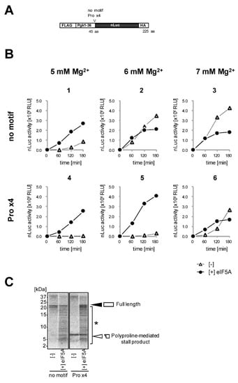 Analysis of translational ability of purified 80S ribosomes and determination of the appropriate Mg2+ concentration to recapitulate the polyproline-mediated ribosomal stalling. After the purification of ribosomes, their translational abilities are checked using the indicated mRNAs (see also Table S4). Shown are the examples: (A) schematic of the mRNAs; (B) translation reactions were performed using mRNA and [35S]methionine-labelled aminoacyl-tRNA mix, with 5–7 mM Mg2+, 0.25 mM spermidine, and 0 mM spermine. Where indicated, 0.5 μM hypusinated eIF5A protein—equivalent to the amount of ribosomes—was included in the reaction. After incubation for the indicated time period, aliquots were subjected to nLuc assay. [-] (open triangle), no protein; [+] eIF5A (closed circle), eIF5A(hyp). (C) After 180-min reaction, the translation products at 6 mM Mg2+ (Panels 2 and 5 in (B)) were analyzed by Tricine SDS-PAGE. Black triangle, full-length product; open triangle, polyproline-mediated stall product. Asterisk indicates unknown products that are specifically produced in the presence of eIF5A, and may possibly be premature termination products (see text and [24]). For the preparation of eIF5A, see Appendix C.
