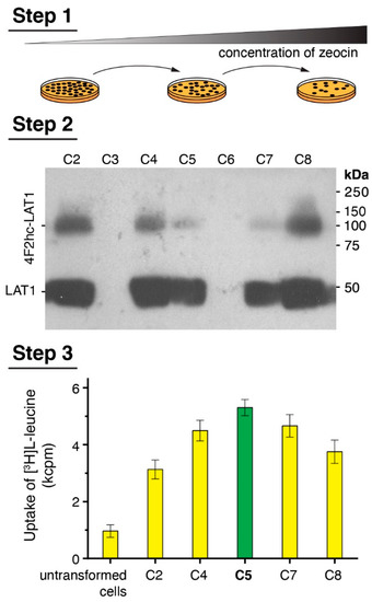 A medium throughput procedure based on three individual steps was performed to select P. pastoris clones expressing the covalently linked heterodimeric complex 4F2hc-LAT1 at high levels (Figure 1), of which its individual subunits were either N-terminally His-tagged (4F2hc) or Strep-tagged (LAT1). First, 160 clones were picked from agar plates containing a low ZeocinTM concentration of 0.2 mg/mL and streaked on agar plates. The procedure was continued by sequentially increasing the ZeocinTM concentration after each round (Figure 1, Step 1) to screen for the highest copy number of 4F2hc-LAT1 integrants into the Pichia genome [37,44]. Second, 28 clones, which grew on agar plates containing 4 mg/mL ZeocinTM, were selected and used for small-scale protein expression experiments in 24-well plate format. Expression levels of 4F2hc-LAT1 were determined by SDS-PAGE under reducing conditions and immunoblotting using an αStrep-tag-antibody for protein detection; thus, the two bands visible in the Western blot displayed intact and reduced 4F2hc-LAT1 (Figure 1, Step 2). Third, clones displaying a high expression level in Western blots were selected for whole cell L-leucine uptake experiments (Figure 1, Step 3) as previously described [24] (see Figure 1, Step 3). The clone showing the highest uptake signal was finally chosen for large-scale overexpression and protein purification experiments. Importantly, clone no. 8, which in the example given showed the highest expression level in Western blots (Figure 1, Step 2, C8) was not necessarily the one with the highest uptake rate (Figure 1, Step 3, C5) and vice versa. Therefore, the medium throughput three-step overexpression clone selection procedure presented does not only allow for screening of clones, indicating high protein expression levels but also integrating protein function in the selection process. In addition, different constructs and expression conditions, e.g., differently tagged proteins, expression times, and methanol concentrations, may be screened individually to elucidate best expression strategy for the target membrane protein.