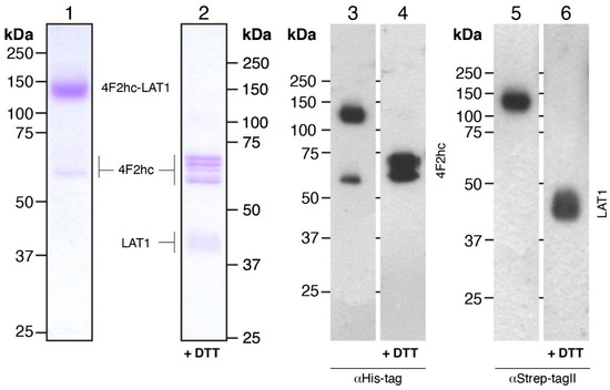 SDS-PAGE analysis of Coomassie Brilliant Blue-stained gels and Western blots. 4F2hc-LAT1 purified protein samples after double affinity purification were analyzed by 10% SDS-PAGE gels. Lanes 1 and 2 (1.5 µg of protein loaded per lane) show Coomassie-stained gels, and lanes 3-6 display Western blots (0.3 µg of protein loaded per lane). The latter were either probed with αHis-tag (lanes 3 and 4) or αStrep-TagII (lanes 5 and 6) antibodies. Lanes 1, 3, and 5 and 2, 4, and 6 depict samples run under non-reducing and reducing conditions, respectively.
