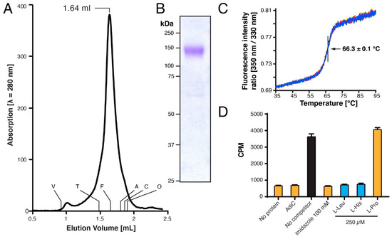 To further verify the homogeneity of the GDN-solubilized 4F2hc-LAT1 heterodimer, we performed SEC. The chromatogram of 4F2hc-LAT1 displayed a prominent, sharp peak, indicating that the double affinity purification procedure applied yielded a pure and monodisperse membrane protein sample (Figure 3A). The elution volume was similar to the GDN-solubilized heterodimeric complex of 4F2hc-LAT2, as previously reported [16]. Since 4F2hc-LAT1 and 4F2hc-LAT2 share a high sequence similarity of 48% and are structurally similar [14,16,20], these data, together with the results obtained from SDS-PAGE and Western blot analysis (Figure 2) further, corroborated correct assembly of the heterodimeric complex 4F2hc-LAT1. SDS-PAGE analyses of the SEC-peak fraction by Coomassie Brilliant Blue staining showed a strong band at ≈140 kDa and faint bands between 60 and 75 kDa (Figure 3B) as prior to SEC (see Figure 2, lane 1). In addition, the SEC elution profile basically displayed no aggregation peak nor peaks resulting from cleaved 4F2hc and LAT1. These findings strengthened our hypothesis that as with 4F2hc-LAT2 [16,19], also in case of 4F2hc-LAT1, free 4F2hc and possibly also LAT1 are truly artefacts of SDS-PAGE. Furthermore, the thermostability of GDN-solubilized 4F2hc-LAT1 was measured by Tycho NT.6 analysis, and an inflection temperature (Ti) of 66.3 °C was determined (Figure 3C). A study to elucidate the impact of the purification detergent on the Ti of membrane proteins was recently published [49]. Here, the authors reported on the Ti values of different α-helical membrane transport proteins solubilized in GDN to be in the range of about 50–63° C. The Ti value of our GDN-solubilized 4F2hc-LAT1 was ≈3 °C higher than these previously reported values and thus reflects heat stable transport protein sample.