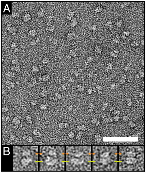 Another method to assess the homogeneity and simultaneously also the low-resolution structure of protein complexes is negative-stain transmission electron microscopy (TEM). For that purpose, GDN-purified 4F2hc-LAT1 was adsorbed on parlodion carbon-coated grids, washed, negatively stained, and examined by TEM. The electron micrograph in Figure 4A shows a homogenous distribution of particles. 4F2hc-LAT1 particles, as viewed from the side, display the typical bilobed shape of 4F2hc-SLC7 heterodimeric particles [10,14,16,18,19,20,50], which are composed of a larger and smaller density (Figure 4B). The dimensions of GDN-purified, recombinant human 4F2hc-LAT1 particles are ≈12 nm (major axes) and ≈10 nm (minor axis). Compared to cryo-EM volumes of GDN-purified 4F2hc-LAT1 [14] or 4F2hc-LAT2 [16], the measured dimensions and shape of our recombinant 4F2hc-LAT1 sample purified from P. pastoris are in excellent agreement.