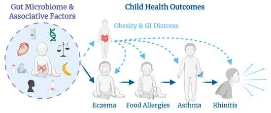 Recently, the gut microbiome has also been demonstrated to play an important role in the development of diseases from infancy into childhood [4]. With a lifetime asthma prevalence of 12.7% in Americans [5], and with the significant increase in the incidence of allergies [6], it is imperative to develop a nuanced understanding of the corollary pathogenesis associated with altered gut microbial conditions in infancy, a time when the immune system is still developing. For example, antibiotic-induced dysbiosis of the infant gut microbiome has been associated with a greater risk of later developing asthma, obesity, and intestinal bowel disease [7,8,9]. Further research is needed to identify the pathways for these associations in light of the numerous confounding variables involved in infant growth and health.
