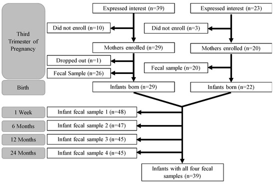 From the overarching ARCH study, n = 39 prospective mothers initially expressed interest in participating in ARCHGUT. Of these, n = 29 provided written, informed consent and completed an enrollment form. One participant dropped out, leaving n = 28 total participants. One mother had twins, accounting for a total of n = 29 mother–infant dyads from the ARCHGUT recruitment branch. For BABYGUT, n = 23 prospective mothers expressed initial interest, with n = 20 enrolling. Of these, n = 2 mothers enrolled two infants in the study, accounting for n = 22 mother–infant dyads from BABYGUT. This leaves a total of n = 51 participants who have enrolled in ARCHBG to date. Of these, n = 39 infants have a complete record of stool samples, with at least n = 45 (88.2%) fecal samples at each timepoint (Figure 2).