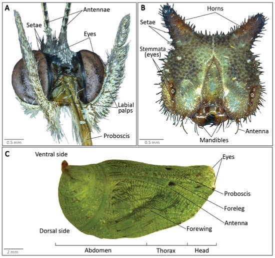 Anatomy of (A) a B. anynana butterfly head (front view), (B) a caterpillar head (front view), and (C) of a pupa.