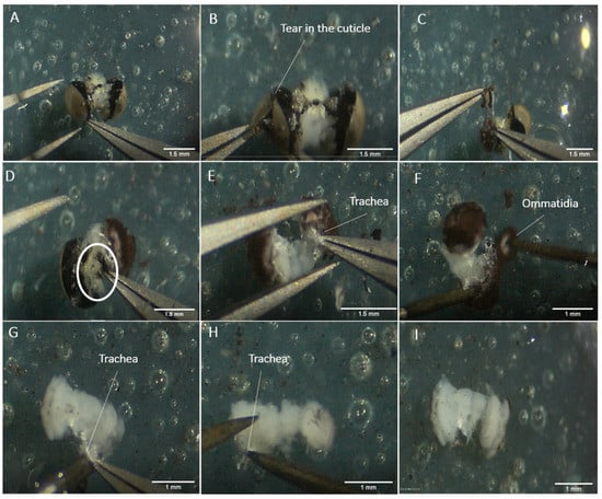 - Secure the head with the curved forceps facing upwards, to get a grip on the region of the cuticle in between the two eyes (Figure 3H);