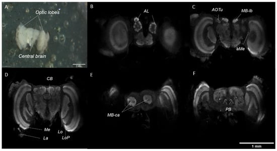 The adult brain is made up of two optic lobes and a central mass, which are clearly defined (Figure 7A). A more in-depth visualisation of the brain anatomy can be achieved through immunostaining, using an antibody targeting synapsin (involved in the regulation of neurotransmitter release at synapses) and confocal microscopy techniques. In brief, the optic lobes consist of five paired neuropils, which are clearly defined: the lamina (La), medulla (Me), accessory medulla (aMe), lobula (Lo), and lobula plate (LoP). The central brain consists of five paired and one unpaired neuropils, which are also clearly defined: the antennal lobes (AL), anterior optic tubercles (AOTu), mushroom body lobes (MB-lb) and calyx (MB-ca), protocerebral bridge (PB), and the central body (CB) (Figure 7B–F).