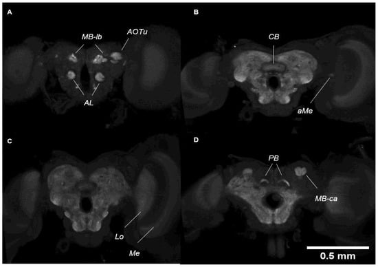 - Kelly, S.M.; Elchert, A.; Kahl, M. Dissection and Immunofluorescent Staining of Mushroom Body and Photoreceptor Neurons in Adult Drosophila melanogaster Brains. J. Vis. Exp. 2017, e56174. [Google Scholar] [CrossRef] [Green Version]