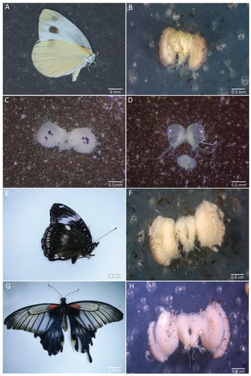- Couto, A.; Wainwright, J.B.; Morris, B.J.; Montgomery, S.H. Linking ecological specialisation to adaptations in butterfly brains and sensory systems. Curr. Opin. Insect Sci. 2020, 42, 55–60. [Google Scholar] [CrossRef]