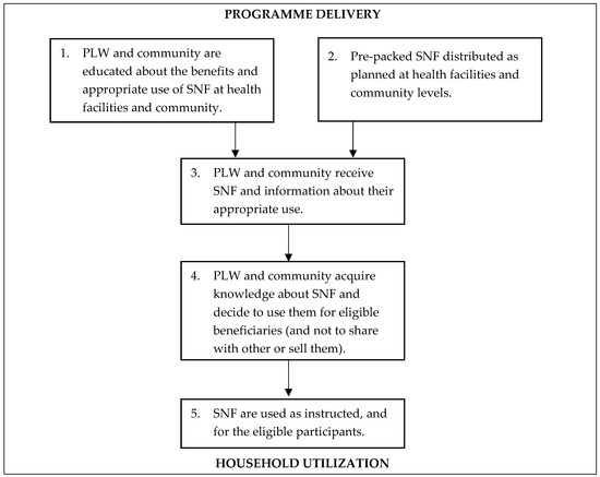 The interventions will focus on the provision of SNF to eligible beneficiaries and SBCC messaging delivered through existing health systems, mobile health teams and CHWs at community levels. All children aged between 6–23 months will receive locally produced lipid-based nutrient supplement–medium quantity (LNS-MQ) and PLW will receive Super Cereal during the study.