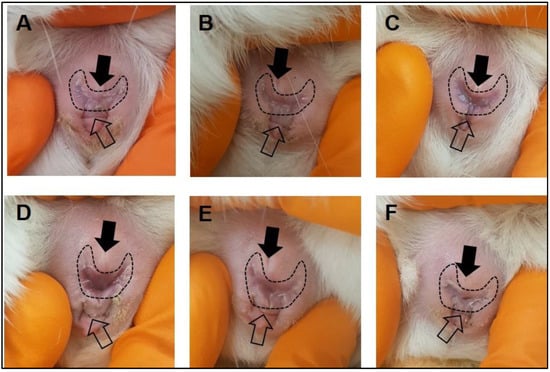 Figure 1. Monitoring of the guinea pig vaginal membrane. During the latent period of the estrus cycle, the guinea pig vaginal membrane (dashed outline) is visibly closed (A,B). Four to five days prior to ovulation, changes to the color of the vaginal membrane can be observed indicating potential membrane perforation (C). At the time of ovulation, the vaginal membrane perforates and increased vaginal secretions/mucus can be observed (D). Following ovulation, the vaginal membrane begins to close (E,F). The closed arrow indicates the urethral opening, the open arrow indicates the anus. - Repeat observations daily, in the morning at approximately the same time of day until the vaginal membrane is observed as perforated (Figure 1). Record the date that vaginal membrane is first observed as perforated.