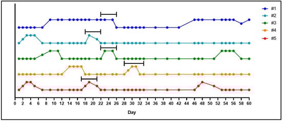 Through monitoring changes to the vaginal membrane, we achieved a 100% pregnancy success rate with first time mating of five female guinea pigs. During the latent period of the estrus cycle, the vaginal membrane will appear as a pale color and visibly closed (Figure 1A,B). In the 4–5 days prior to ovulation, the vagina will undergo noticeable changes in color, becoming progressively darker pink, mild swelling of the vulva can also be noted prior to perforation (Figure 1C). Full perforation of the vagina happens within 24–72 h and is noticeable as a complete opening of the vagina, often associated with increased vaginal secretions/mucous (Figure 1D). The vaginal membrane then closes within 48–72 h of full perforation (Figure 1E,F). Based on these observations, we confirmed the guinea pig estrus cycle to be 15–16 days (n = 4 out of five female guinea pigs) with observations of initial perforation through to closing of the vaginal membrane lasting between 3–6 days (Figure 2). This was the exception for one female whose vaginal membrane remained perforated for approximately 2 weeks after initially being observed as open. Despite this, she was still placed with a male as described in Section 3.