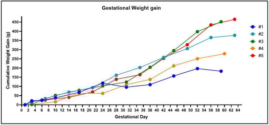 Weight changes in the guinea pig throughout gestation. Noticeable increases in gestational weight are not reliable until mid-pregnancy in the guinea pig. Healthy fetuses were confirmed in all the animals at gestational day 30 using an ultrasound, except for one animal (#1) in which blood in the vaginal lumen was observed at gestational day 24 and was associated with a decrease in cumulative weight gain. At post mortem, #3 had four fetuses, #5 had three fetuses, #2 and #4 had two fetuses, and #1 was not pregnant.