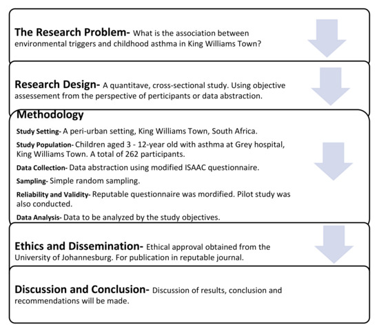 Upon completion of this study, the children and caregivers in King Williams Town, South Africa, will be able to identify and avoid environmental agent(s) that could trigger pediatric asthma. Healthcare workers at Grey hospital will be able to objectively identify common environmental agents that are associated with asthma among children. Asthma treatment within the locality will be reprioritized, to focus on environmental factors as well as health education. A flow diagram of this manuscript, identifying the various stages, is provided in Figure 1.