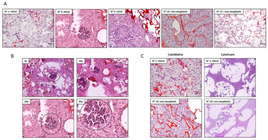 - CytoFoam is a 12-mm disc previously described in literature and used to adsorb various cytological samples, as fine needle aspiration of thyroid carcinomas or plasma for the evaluation of circulating tumor cells [27,28]. It is a diagnostic tool similar to CytoMatrix, since it is processed as a tissue fragment, formalin-fixed, paraffin-embedded, and used for IHC or other molecular analyses. We used CytoFoam, as previously described, to absorb our cell suspensions from urine specimens in order to compare the results obtained with CytoMatrix [27,28]. Interestingly, when compared with this CytoFoam adsorbent support, CytoMatrix can improve the amount of cells and can also confer an architecture or a "tissue-like" structure (Figure 2C).