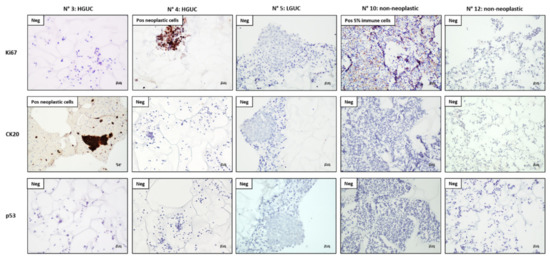 - Ki67 staining was positive in neoplastic cells of two HGUC (N° 2, 4), while the other HGUC (N° 1, 3) showed negative staining. Staining of Ki67 was negative in LGUC and non-neoplastic cases; however, two non-neoplastic samples (N° 10, 11) showed weak positivity for Ki67 (<5% of cells) in granulocytes and immune cells (Figure 4).
