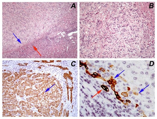 Hepatocellular carcinoma, moderately differentiated (Grade 2, WHO 2019): (A) a circumscribed tumor with a pseudocapsule (blue arrow) that separates it from the adjacent normal parenchyma (red arrow) (hematoxylin/eosin, ×100); (B) the tumor has a trabecular growth pattern and the neoplastic cells have abundant pale or eosinophilic nuclei with moderate nuclear atypia and prominent nucleoli (hematoxylin/eosin, ×200); (C) immunohistochemical positive expression of HepPar1 (blue arrow) confirms the hepatocytic differentiation of tumor cells (×200); (D) immunostaining of keratin 19 in few (<5%) tumor cells (blue arrow). The normal adjacent bile ducts serve as an internal positive control (red arrow) (×600).