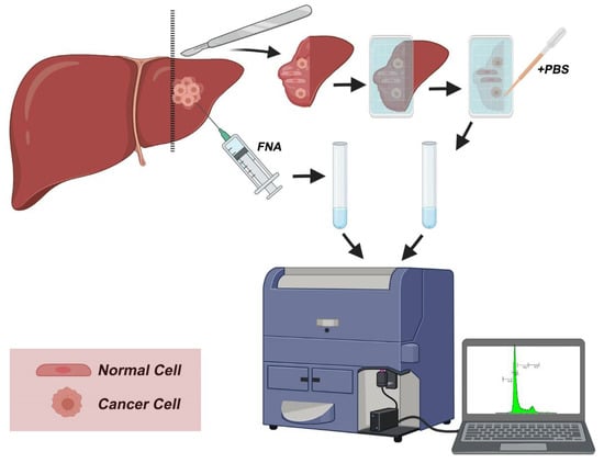 Flow cytometry (FC) is a powerful analytical technique with several applications in phenotypic analysis and the quantification of cellular processes, such as cell proliferation and cell death []. The quantification of state/phenotype of a cell population is among the main advantages of FC to other methods, such as microscopy. DNA analysis is among the first widely used applications of FC, even before the development of methodologies including monoclonal antibodies []. Τhe concept of intraoperative flow cytometry (iFC), was based on flow cytometric quantification of DNA content/ploidy and cell cycle distribution during surgery for cancer cell analysis and margin evaluation. The rationale of iFC offered the ability for intraoperative diagnosis, which serves as an alternative to pathology evaluation of tissue sections obtained during surgery of central nervous tumors (CNSTs) []. A modified rapid protocol for cell cycle analysis developed in the University Hospital of Ioannina (“Ioannina Protocol”) allowed the intraoperative characterization of intracranial lesions and their surgical margins in 6 min per sample. A significant difference in G0/G1 phase, as well as in S-phase and G2/M fractions between high-grade and low-grade tumors was demonstrated. In glioblastoma patients, significant differences were observed between tumor mass and margins regarding the G0/G1 phase, the S-phase, and (G2/M) tumor fraction (tumor index), offering the potential of delineating tumor margins in gliomas []. As regards prognosis, recent data suggest that calculation of malignancy index based on iFC may also act as a novel prognostic factor following radiotherapy and chemotherapy with temozolomide []. The utility of iFC is currently being expanded beyond CNSTs into the analysis of tumor margins in several additional cancer types [], with candidates such as head-and-neck malignancies [,] and breast cancer []. The rationale of the current study is the presentation of a novel modified protocol that uses a touch imprint on a nylon membrane of the hepatic transaction area, in order to obtain cells for flow cytometric analysis. The modified protocol is used for cancer cell characterization and margin detection during the excision of primary and metastatic liver neoplasms. The study is based on the established role of iFC by DNA-content and phenotypic analysis in CNSTs, breast-, and head-and-neck lesion-conserving surgeries, previously investigated by our research team [,,,].
