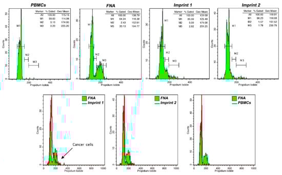 In aneuploid tumors, the discrimination between normal and cancer cells is solely based on DNA index. In such cases, cancer cells in an imprint would appear as a distinct aneuploid peak, determined by the analysis of the respective FNA sample.