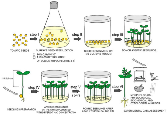 Therefore, we have developed and tested a simple and effective bioassay method suitable to comparative in vitro study of tomato salt tolerance using shoot apex of seedlings at the early first-true-leaf stage. This short-term bioassay method allows researchers to obtain correct experimental data for morphometric, physiological, biochemical, and cytological analyses at the different organization levels. The proposed methodological approach can be used for other plants with a high response to auxin-induced rhizogenesis in vitro. In addition, it can also be useful for the comparative in vitro assessment of other abiotic stresses, such as exposure to heavy metals or PEG-induced osmotic stress, as well as for a comparative assessment of control and transgenic plants expressing heterologous genes.