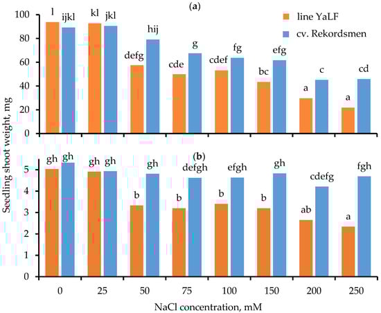 The dramatic difference between tomato genotypes was observed by a change in the SDW under salt treatments (Figure 3b). As in the case of the SFW, reduce of SDW in the line YaLF occurred under weak salinity (50 mM NaCl). On the contrary, there were no statistically significant differences between the control and experimental treatments for SDW in the cv. Rekordsmen. It should be noted that seedlings of both tomato genotypes cultured on the RIM containing 100 mM NaCl and higher had cotyledon with obvious signs of chlorosis, the extent of which becomes more pronounced under increased stressful salinity conditions. Moreover, the growth of true leaves was inhibited in tomato seedlings under moderate salinity (100–150 mM NaCl), while their formation did not occur by 200–250 mM NaCl treatments.