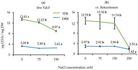 Respiratory and photosynthetic CO2 gas exchange in in vitro tomato seedlings was assessed using intermediate and sublethal NaCl concentrations experimentally established for each genotype (Figure 4). Significant reduction of TPR and DRR (by 1.1 and 1.3 times, respectively) was observed during cultivation of tomato seedlings line YaLF under 75 mM NaCl treatment compared to control. A subsequent decrease of TPR in seedlings line YaLF was noted on a RIM containing a sublethal NaCl concentration (Figure 4a). Compared with the line YaLF, significant differences in TPR and DRR for tomato seedlings of the cv. Rekordsmen between control conditions, as well as 75 and 150 mM NaCl treatments was not found. The change of respiratory and photosynthetic CO2 gas exchange in this genotype occurred only under 250 mM NaCl (Figure 4b).