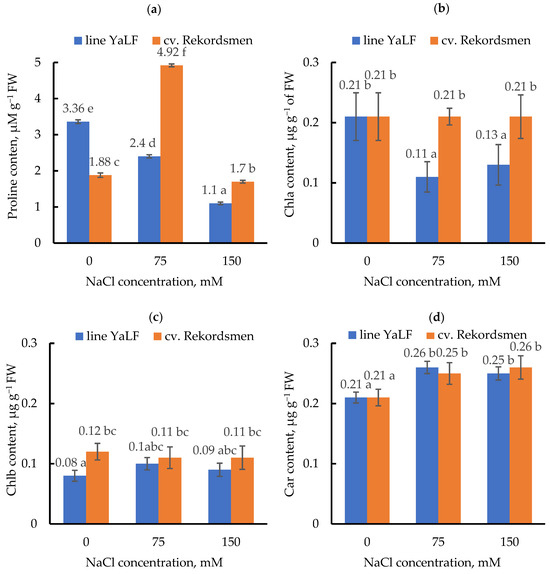 The dramatic differences between tomato genotypes were observed by a change in the contents of proline and Chla under salt treatments (Figure 5a,b). Significant reduction of proline (by 1.4 and 3.1 times) and Chla (by 1.9 and 1.6 times) contents occurred during cultured of tomato seedlings line YaLF under 75 and 150 mM NaCl treatment compared to control. On the contrary, the content of proline in leaves of tomato cv. Rekordsmen significantly increased under 75 mM NaCl, while the content of Chla under 75 and 150 mM NaCl treatments did not differ from the control values.