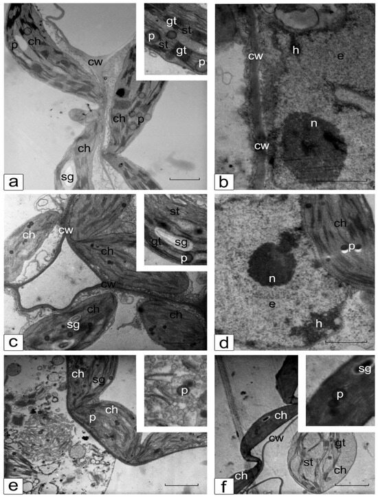 Ultrastructure of chloroplast (a,c,e,f) and nuclear (b,d) compartments in the cotyledonary SM cells of control (a,b) and salt-treated (150 mM NaCl) (c–f) tomato seedlings of the line YaLF. Ch, chloroplast; gt, st, granal and stromal thylakoids, respectively; cw, cell wall; e, euchromatin; h, heterochromatin; n, nucleolus; p, plastoglobuli; sg, starch grain. Scale, 1 µm.