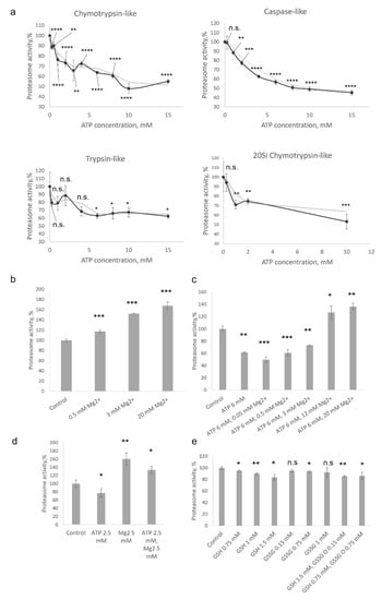 To estimate how other small molecules affect 20S proteasome activity, we used glutathione—the most abundant low-molecular-weight thiol compound synthesized in cells []. Glutathione maintains redox homeostasis and protects cells from oxidative damage. A reaction mixture containing 100 ng of constitutive 20S proteasomes and Suc-LLVY-AMC substrate was supplemented with different concentrations of reduced (GSH) or oxidized glutathione (GSSG), or their mixtures. Physiological concentrations of reduced (GSH) and oxidized glutathione (GSSG), which is increased in stress conditions, were used. It has been shown that with the increase of GSH concentration, the efficacy of substrate degradation by 20S proteasomes decreases, although to a lesser extent than in the case of equimolar concentrations of ATP (Figure 1a,e).