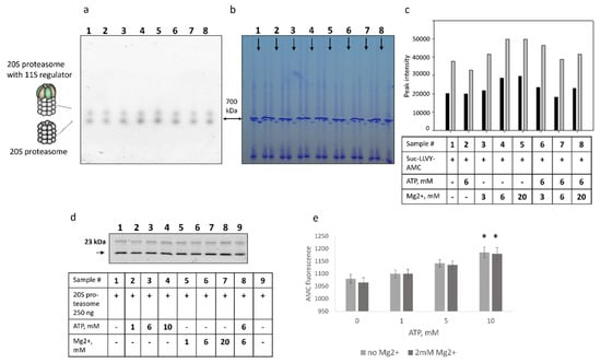 Next, we investigated the effect of both ATP and Mg2+ ions on the 20S proteasome preparations in the Native gel. Commercial 20S proteasome preparations revealed two forms of proteasomes with distinct molecular weights—700 kDa and 800–900 kDa, respectively. Based on previous findings by us and others and Western blot analysis (not shown), the heavier form represented 20S proteasome with 11S activator. Hence, we sought to evaluate if the effect of ATP and Mg2+ on these two proteasome forms is different. The obtained results (Figure 2a–c) revealed separate and mutual effects of ATP and Mg2+ on the degradation of fluorogenic substrates by the 20S proteasomes (Figure 1b–d). The activity of the 20S proteasome with the 11S regulator followed the same dynamics as the activity of the 20S proteasome, though with the lesser amplitude, indicating that ATP/Mg2+ influences the turnover of fluorogenic peptides by both proteasome forms.