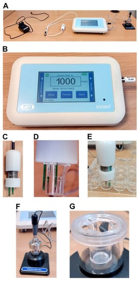 The overview of EVOM3 (epithelial volt–ohm meter) system with all its components, used for the transepithelial/transendothelial electrical resistance (TEER) measurements (from left to right: A/C power supply and charger, STX2-Plus electrode, EVOM3 meter and the optional Endohm-6G chamber electrode). (A) the general view of the whole EVOM3 system. (B) The EVOM3 meter with the 1 kOhm test resistor inserted into the electrode port: the display shows the actual resistance of the test resistor. (C) The body of the STX2-Plus chopstick electrode. (D,E) The proper adjustment of STX2-Plus electrode to fit the insert with a 6.5 mm diameter (compatible with 24-well plates): the outer electrode reaches close to the bottom of the well plate, while the inner electrode is close to the membrane inside the insert, without touching it. (F) The Endohm-6G chamber electrode with the 6.5 mm cell culture insert inside the chamber, connected with the EVOM3 meter by the Endohm cable. (G) The detailed view of the Endohm-6G chamber with the cell culture insert.
