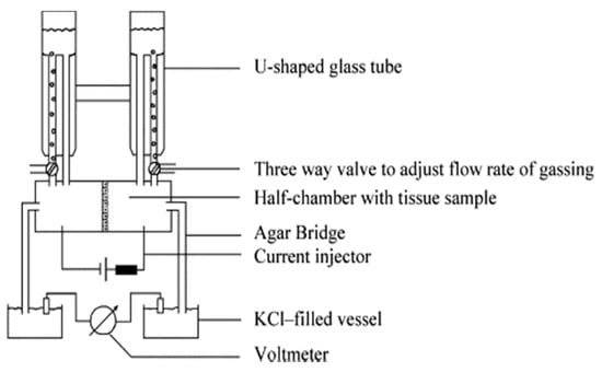 The Ussing chamber system was originally designed by the Danish zoologist Hans Ussing in the 1950s, to study the net transport of ions through the skin of a frog []. It is a simple but powerful technique used to investigate ion transportation across any relevant tissue, including the endothelium and epithelium []. The Ussing chamber consists of the chamber itself and the electrical circuitry, which allows for the measurement of the current resistance, intensity, voltage, impedance and capacitance. There are two types of Ussing chambers: the circulating chamber and the continuously perfused chamber. The continuously perfused chamber will not be described in this review, since this is not commercially available. The circulating chamber consists of a U-shaped tubing system usually made of glass that is filled with the experimental solution (Figure 3). The tubing can be heated and is gassed with air, carbon dioxide, O2, or N2. The gassing oxygenates the solution contents and stirs the liquid to provide the complete convection, the so-called ‘bubble lift’. The U-shaped tube prevents the damage caused by the bending of the tissue, since it balances the hydrostatic pressure on both sides of the chamber. During the experimental procedure, the substances are added to one or both sides of the tube in a sequential manner, thus they are present in the solution until the end of the experiment.
