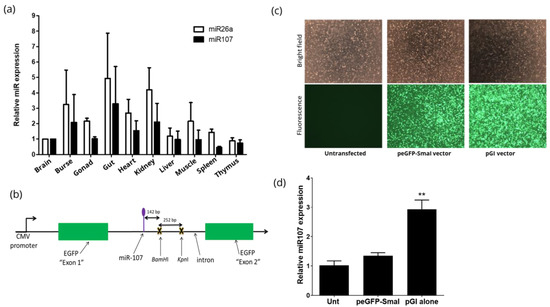 To examine if an exogenous shRNA could be expressed by utilising natural miRNA processing pathways, we began by identifying a miRNA that is highly expressed in different tissues of the chicken. Previously, our laboratory had carried out deep sequencing of RNA from chicken embryos [24] and analysis of this data identified two potential candidates; miR107 which was 35th on the RNAseq count and miR26a which was 56th on the RNAseq count. The reads for miR107 ranged from 36813–26822 while the reads for miR26a ranged from 15108–19010. Next, we consulted the gallus expression in situ hybridisation analysis (GESHIA) website [25], which has in situ hybridisation data for all known chicken miRNAs. The GESHIA website showed widespread expression of both miR26a and miR107 except in the heart of the Hamburger–Hamilton (HH) stage 25 chicken embryos (data not shown). To confirm the expression data, we carried out qRT-PCR analysis on total RNA extracted from organs of HH stage 44 chicken embryos and found that both miR26a and miR107 were expressed in all examined tissues, including the heart (Figure 1a). Prior to selecting the candidate miRNA for parallel processing, we examined the genomic location at which these miRNAs were located. The location of miR107 is in a ~3.5 kb intron of pantothenate kinase 1 (PANK1) (Gene ID: 423792), this essential gene is involved in the Pantothenate and Coenzyme A (CoA) biosynthesis pathway [26]. While miR26a is in a ~10 kb intron of carboxy-terminal domain small phosphatase-like protein (Gene ID: 408252). Due to its more consistent expression and location within a smaller intron of an essential gene, we selected miR107 for the parallel processing approach.