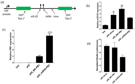 To examine if parallel processing of an exogenous shRNA can be achieved by positioning a single shRNA next to miR107, the intron within the pGI vector was modified to contain BamH1 and KpnI restriction enzyme (RE) sites to subsequently clone the shRNA sequences (Figure 1b). The influenza PB1 siRNA (hereafter referred to as PB1) was chosen as a target sequence to generate shRNA structures using a classic brummelkamp (BK) loop or miR30 structure to generate BK-PB1 and miR30-PB1 shRNAs, respectively (Figure S1). The designed shRNAs were individually cloned into BamH1 and Kpn1 RE sites of the pGI vector to generate pGI_BK-PB1 and pGI_miR30-PB1, respectively (Figure 2a). Following the transfection of these vectors individually into DF1 cells, eGFP expression was confirmed at 48 h post-transfection, indicating that the addition of the shRNA into the pG1 vector did not interfere with intron splicing (data not shown). Total RNA extracted from the transfected cells was used to quantify expression levels of miR107 and PB1 shRNA. The miR107 levels in cells transfected with pGI alone, pGI_BK-PB1 and pGI_miR30-PB1 were elevated compared to untransfected cells (Figure 2b). Between the different pGI vector transfected DF1 cells, we observed significantly higher levels of miR107 in pGI_BK-PB (p < 0.001) compared to the base pGI vector or pGI_miR30-PB (Figure 2b). The levels of the PB siRNA in cells transfected with the miR structured shRNA (pGI_miR30-PB1) were approximately 4.5-fold more than those transfected with the BK loop shRNA (pGI_BK-PB1) (p < 0.0001) (Figure 2c). Next, to assess if the shRNAs were being processed and could mediate targeted knockdown of the PB1 gene of influenza A virus, the vector psiCHECK2 containing the PB1 (psiCHECK-PB1) target region was used. DF1 cells were co-transfected with the pGI _BK-PB1 or pGI_miR30-PB1 and psiCHECK-PB1, followed by measurement of firefly and renilla luminescence at 48 h post transfection. Results indicated that cells transfected with pGI_miR30-PB significantly (p < 0.01) reduced the levels of normalised renilla luminescence compared to base pGI vector or pGI_BK-PB (Figure 2d) which indicates target gene knockdown. Combined the qRT-PCR and knockdown assay confirm the expression and processing of the introduced shRNAs.