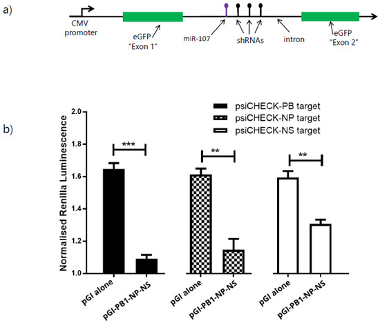 When targeting an exogenous agent such as a virus, the application of multiple shRNAs can overcome any limitations that arise due to the emergence of escape mutants [27,28]. To assess whether multiple shRNAs can be processed by the parallel processing approach we expressed three miR30 structure based shRNAs targeting influenza genes (PB1, NP and NS). These were positioned downstream of miR107 within intron 5 of the PANK1 gene (Figure S3). The synthesised intron fragment with three shRNAs was positioned downstream of miR107 within the pGI vector to generate pGI-PB1-NP-NS (Figure 3a). Following the transfection of pGI-PB1-NP-NS into DF1 cells, fluorescent microscopy analysis confirmed eGFP expression in transfected cells (data not shown), indicating that the addition of the synthesised fragment with three shRNAs into the pGI vector did not interfere with intron splicing. To assess if the shRNAs expressed from pGI-PB1-NP-NS could mediate targeted knockdown, DF1 cells were co-transfected with either pGI (negative control) or pGI-PB1-NP-NS (test) and one of the three psiCHECK2 constructs (psiCHECK-PB1, psiCHECK-NP or psiCHECK-NS target). The renilla luciferase and firefly luciferase levels were measured 48 h post transfection. Results indicated that the expression of multiple shRNA from the pGI-PB1-NP-NS vector significantly reduced the levels of normalised renilla luminescence compared to the pGI vector alone for all the corresponding targets (Figure 3b) indicating that the three shRNAs expressed from the intron have mediated targeted knockdown.
