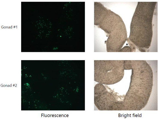 Analysis of gonads from chicken embryos injected with the pTol-GI-PB1-NP-NS vector. The eGFP and bright field images of gonads dissected from HH stage 40 chicken embryos that were injected with pTol-G1-PB1-NP-NS at HH stage 14–15.