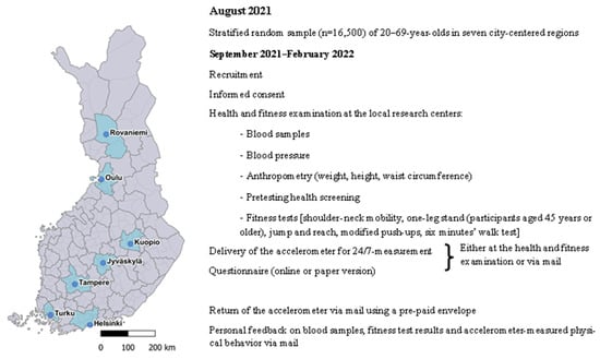 The FINFIT 2021 is a cross-sectional population study based on a stratified random sample of 20–69-year-old Finnish men and women from seven city-centered regions (Helsinki, Turku, Tampere, Jyväskylä, Kuopio, Oulu, and Rovaniemi). Potential participants are drawn from a population census: from seven regions, 150 men and women in five age groups (20–29, 30–39, 40–49, 50–59, and 60–69) are drawn, adding up to a total of 10,500 individuals. Additionally, 1500 individuals are drawn from the Helsinki region and 500 from 9 municipalities from the Tampere and Turku regions. This will sum up to a total of 16,500 individuals. Invitation letters containing information about the study and informed consent, with an option to withdraw from the study at any time, are being mailed to potential participants.