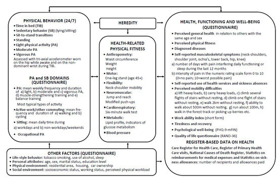 The conceptual design of the study is based on the modified version of the Toronto model on Physical Activity, Fitness and Health [39]. The main measurements of the FINFIT 2021 study are listed according to this model in Figure 2.