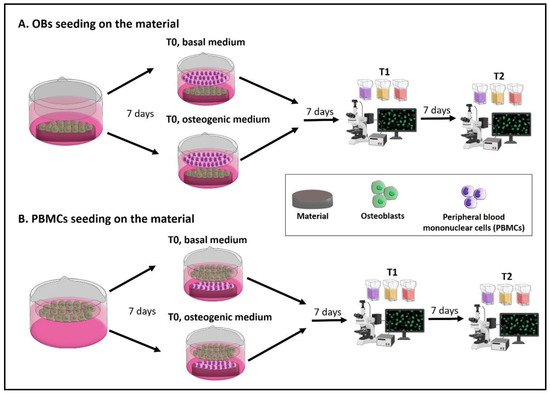 - The seeding of OBs on the material with PBMCs in the indirect co-culture. Seed OBs on the material and wait 7 days until cell confluence, then seed PBMCs into the transwell to begin the indirect co-culture (T0). The indirect co-culture is maintained in osteogenic medium or basal medium for 14 days (T2), with the intermediate step of 7 days (T1) to check cell behavior.