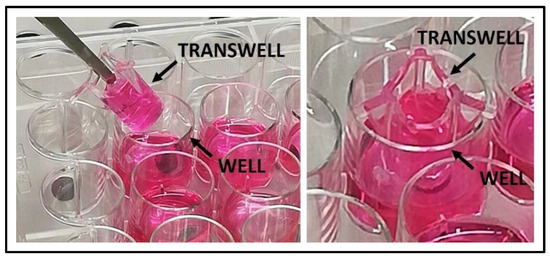 - Transwell device: insert for 24-well tissue culture plate, with polyethylene terephthalate (PET) membrane and polystyrene (PS) as frame material, transparent, sterile, non-pyrogenic/endotoxin-free, non-cytotoxic, with a flat base, 0.4 µm pore size, 0.3 cm2 growth area, 0.1–0.4 mL working volume (SARSTEDT, 83.3932.041, Nümbrecht, Germany). Please note that is important that the transwell fit into the well of the 24-well tissue culture plates and the plate can be closed.