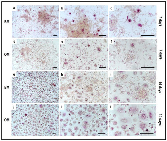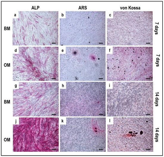 The single-culture of OBs is performed both in BM and OM for 14 days. At 7 days of culture, the ALP positivity is detected both in BM (Figure 5a) and OM (Figure 5d). At 14 days OBs displayed a strong ALP positivity and several calcium deposits by ARS and von Kossa methods when cultured in OM (Figure 5j–l) compared to BM (Figure 5g–i).
