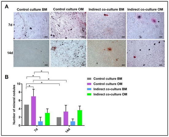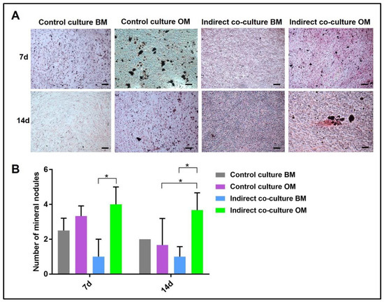 Similarly, the quantification of mineral nodules by von Kossa stain (Figure 7) showed the same trend, with the indirect co-culture in OM displaying the highest data.