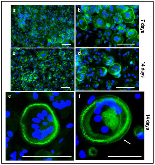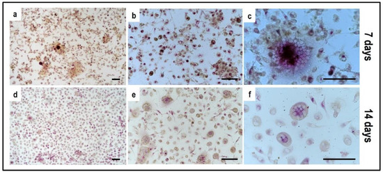 The single culture of PBMCs supplemented with M-CSF and RANKL, which is the medium for the PBMCs’ commitment towards OCs, confirmed the formation of mature multinucleated large cells with positive staining for actin ring after 14 days of stimulation (Figure 11c,d). Osteoclasts with a clearly defined peripheral actin ring and a number of blue nuclei can be appreciated at higher magnification (Figure 11e,f). At the same time, the expression of TRAP-positive spots increased over time (Figure 9). It is important to notice that the formation of the actin ring, podosomes and other cell structures strongly depends on the material (plastic/glass/bone or dentine) the PBMCs are cultured onto.