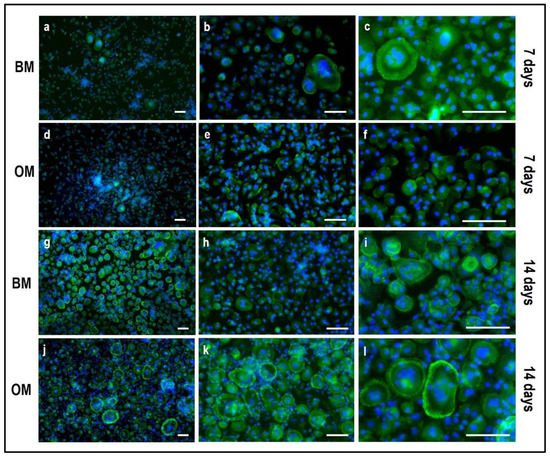 By phalloidin-FITC staining of actin, a remarkably higher number of large multi-nucleated cells with an evident actin ring when cultured in OM (Figure 10j–l) may be observed in comparison to BM (Figure 10g–i), especially at day 14. The quantification of actin filaments can be performed to acquire quantitative data on phalloidin-FITC-stained samples. With this aim, the software NIS-Elements Advanced Research (Nikon, Amsterdam, The Netherlands) has been applied to calculate the area occupied by positive stain in order to compare the data among the controls (single-culture of PBMCs, Figure 11) and the indirect co-cultured PBMCs exposed to BM and OM. As reported in Figure 13, the indirect co-culture in OM showed better results in comparison to control culture, confirming that the presence of osteogenically-induced OBs provide enough stimuli for OCs in the absence of M-CSF and RANKL.