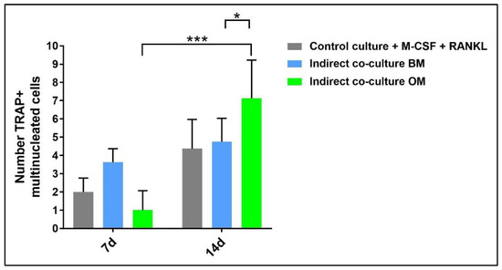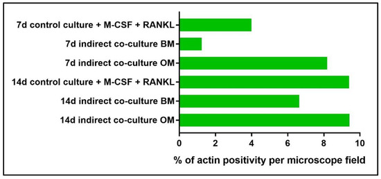 Hence, the maintenance of the co-culture in OM leads to a more marked differentiation of PBMCs toward OCs at 14 days, with enhanced TRAP-positive expression and consistent actin filaments in comparison to the BM condition, therefore confirming the paracrine activity of OBs towards PBMCs.