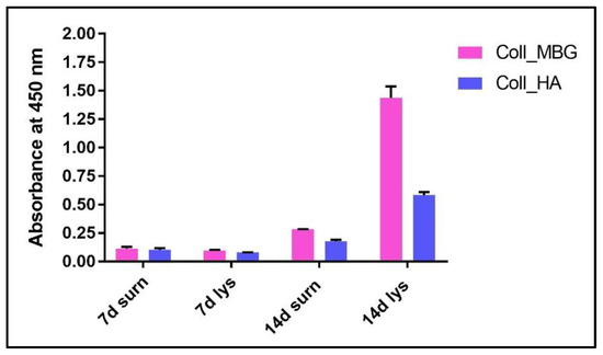ALP stain can be substituted by ALP quantification in both supernatants and cell lysates (OBs), as shown in Figure 14, where the highest value of ALP production was detected for Coll_MBG at 14 days in cell lysate.